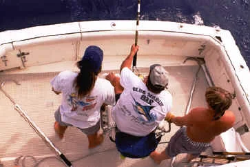 At some point early in the trip, the skipper will set the course for where he thinks you have a chance of catching fish, and the crew should take you through a “chair drill;” allowing each member of the party to practice the technique of reeling a fish from the fighting chair for as long as they like. Many people, even experienced anglers, have never felt a rod and reel of this size before, and the equipment does take some getting used to. You have every right to sit in the fighting chair and practice until you feel comfortable with the equipment, and you shouldn’t feel strange for asking. Remember, about 75% of all people who go fishing on a charter boat in Hawaii have never big game fished before, so don’t feel foolish about wanting to practice…..you aren’t alone!!