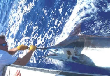 The angler got into the chair and the fight was on. 45 minutes later, the fish was under the boat, as strong as ever. A few minutes later, the fish was let go unharmed, and the mood on board changed from a group of people who knew nothing about each other to one of name and address exchanges. Hands danced as they pointed to the sea describing the action of the fish as it leaped to the sky. Frowns turned to smiles, and for this day, the captain was a hero. The angler mounted the fish based on the estimated measurements, and the others that witnessed the great Marlin were the first ones to the photo developers that afternoon.