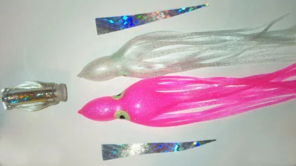 Most wings are cut in a long, narrow triangular shape, but some add a little flare at the bottom for good measure. However you’d like to finish them, the leading end should run about 3/8” to ½” wide, tapering down to a point or double point. Wings can be from about 5 to 7 inches long. Pre-tie a wide, looping constructor knot and slip it down the lure head. Then, take the two wings and hold them against the lure head with just the last 1/8” exposed past the joint between the skirt and lure head. The wings should line up over the eyes on the skirts and the tailing ends (yes, the pointy ends) should be pointing forward toward the leading edge (or boat end) of the lure. Slowly cinch the knot down over the wings, and move the knot to one side or another under one wing.