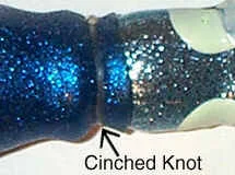 Cut the skirt heads, and slide the inner skirt onto the lower skirt ring of the lure head. You can usually do this one without any soap. As you slide the skirt up, make a constructor knot (see description and diagram shown at bottom of page if you don't know how to tie this knot), slide the knot over the skirt, cinch down, and finish the knot with an overhand hitch. The finished knot looks like a regular square knot, but the added twist under the loop of the constructor knot helps to keep it all cinched down and solid.