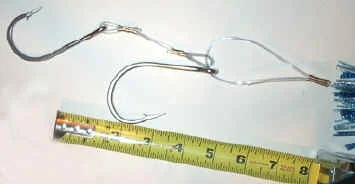 2 pieces at about 1 ½” long, one for the spacing between hooks and the other to create a loop for the lead hook and the trailing hook assembly
