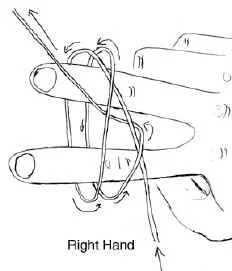 Hold your weaker hand out, palm down, thumb toward you, and split your first two fingers like a peace sign. Take 5-10 inches of the wax line, and drape over your index finger, then over the middle finger. Go down, come back to the index finger, back to the middle finger so you have 2 loops that are about an inch and a half in diameter. Take the line and go under the two loops. It should look like a regular half-hitch with an extra loop.